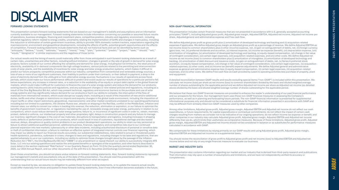 2 DISCLAIMER 3 Q 2 5 E A R N N IN G S P R E S E N T A T IO N FORWARD LOOKING STATEMENTS This presentation contains forward-looking statements that are based on our management’s beliefs and assumptions and on information currently available to our management. Forward-looking statements include information concerning our possible or assumed future results of operations, business strategies, financing and investment plans, competitive position, industry and regulatory environment, including potential regulatory reform related to energy credits, uncertainty relating the implementation of tariffs and changes in trade policy, including the reduction or elimination of certain government incentives, ability to provide 100% domestic content trackers, expectations regarding the macroeconomic environment and geopolitical developments, including the effects of tariffs, potential growth opportunities and the effects of competition. Forward-looking statements include statements that are not historical facts and can be identified by terms such as “anticipate,” “believe,” “could,” “estimate,” “expect,” “intend,” “may,” “plan,” “potential,” “predict,” “project,” “seek,” “should,” “will,” “would,” “designed to” or similar expressions and the negatives of those terms. Our actual results and the timing of events could materially differ from those anticipated in such forward-looking statements as a result of certain risks, uncertainties and other factors, including without limitation: changes in growth or the rate of growth in demand for solar energy projects; factors outside of our control affecting the variability and demand for solar energy, including but not limited to, the retail price of electricity, availability of in-demand components like high voltage breakers, various policies related to the permitting and interconnection costs of solar plants, and the availability of incentives for solar energy and solar energy production systems, which makes it difficult to predict our future prospects; competitive pressures within our industry; competition from conventional and renewable energy sources; a loss of one or more of our significant customers, their inability to perform under their contracts, or their default in payment; a drop in the price of electricity derived from the utility grid or from alternative energy sources; fluctuations in our results of operations across fiscal periods, which could make our future performance difficult to predict and could cause our results of operations for a particular period to fall below expectations; any increase in interest rates, or a reduction in the availability of tax equity or project debt capital in the global financial markets, which could make it difficult for customers to finance the cost of a solar energy system and reduce the demand for our products; existing electric utility industry policies and regulations, and any subsequent changes or new related policies and regulations, including as a result of the One Big Beautiful Bill Act, which may present technical, regulatory and economic barriers to the purchase and use of solar energy systems and may significantly reduce demand for our products or harm our ability to compete; the interruption of the flow of materials from international vendors, which could disrupt our supply chain, including as a result of the imposition of new and/or additional duties, tariffs and other charges or restrictions on imports and exports; changes in the global trade environment, including the imposition of import tariffs or other import restrictions; geopolitical, macroeconomic and other market conditions unrelated to our operating performance including but not limited to a pandemic, the Ukraine-Russia war, attacks on shipping in the Red Sea, conflict in the Middle East, inflation and interest rates; our ability to convert our orders in backlog into revenue; the reduction, elimination or expiration, or our failure to optimize the benefits of government incentives for, or regulations mandating the use of, renewable energy and solar energy, particularly in relation to our competitors, which could reduce demand for solar energy systems; failure to, or incurrence of significant costs in order to, obtain, maintain, protect, defend or enforce, our intellectual property and other proprietary right; delays in construction projects and any failure to manage our inventory; significant changes in the cost of raw materials; disruptions to transportation and logistics, including increases in shipping costs; defects or performance problems in our products, which could result in loss of customers, reputational damage and decreased revenue; delays, disruptions or quality control problems in our product development operations; our ability to retain our key personnel or failure to attract additional qualified personnel; additional business, financial, regulatory and competitive risks due to our continued planned expansion into new markets; cybersecurity or other data incidents, including unauthorized disclosure of personal or sensitive data or theft of confidential information; a failure to maintain an effective system of integrated internal controls over financial reporting, which may impair our ability to report our financial results accurately; our substantial indebtedness, risks related to actual or threatened public health epidemics, pandemics, outbreaks or crises; changes to laws and regulations, including changes to tax laws and regulations, that are applied adversely to us or our customers, including our ability to optimize those changes brought about by the passage of the Inflation Reduction Act (“IRA”), the One Big Beautiful Bill Act (“OBBB”) or any amendment or repeal thereof; our ability to successfully integrate APA Solar, LLC into our existing operations and realize the anticipated benefits or synergies of the acquisition; and other factors described in more