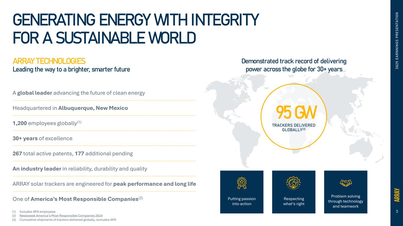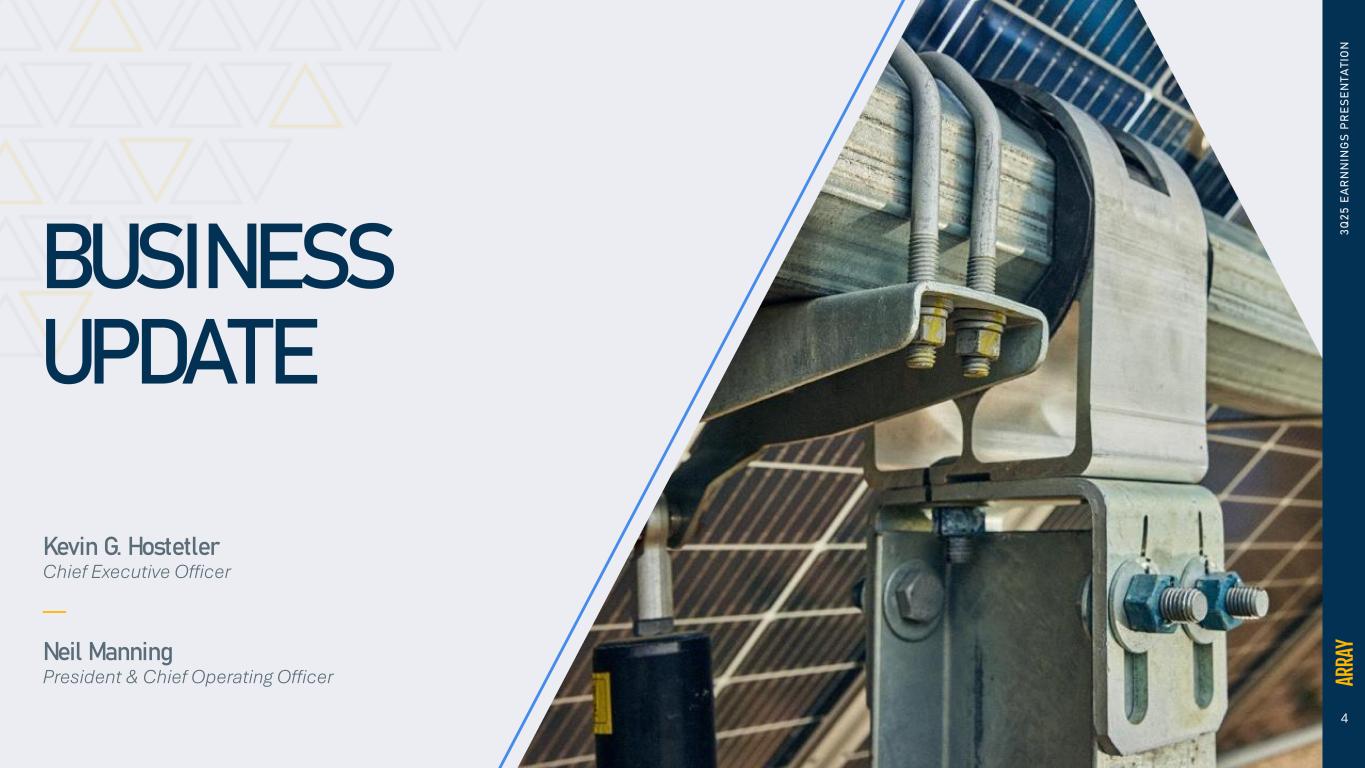 3 3 Q 2 5 E A R N N IN G S P R E S E N T A T IO N GENERATING ENERGY WITH INTEGRITY FOR A SUSTAINABLE WORLD ARRAY TECHNOLOGIES Leading the way to a brighter, smarter future A global leader advancing the future of clean energy Headquartered in Albuquerque, New Mexico 1,200 employees globally(1) 30+ years of excellence 267 total active patents, 177 additional pending An industry leader in reliability, durability and quality ARRAY solar trackers are engineered for peak performance and long life One of America’s Most Responsible Companies(2) 95 GW TRACKERS DELIVERED GLOBALLY(3) Demonstrated track record of delivering power across the globe for 30+ years Putting passion into action Respecting what’s right Problem solving through technology and teamwork (1) Includes APA employees (2) Newsweek America’s Most Responsible Companies 2024 (3) Cumulative shipments of trackers delivered globally, excludes APA
