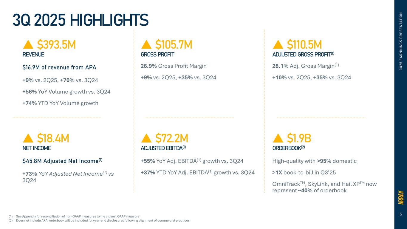 “ARRAY posted another outstanding quarter of strong performance across our key metrics, including significant revenue and volume growth year-over-year of 70% and 56%, respectively, delivering our second highest quarter of Adjusted EBITDA on record. Robust bookings in the quarter reflect the deep trust and expanding partnerships we have cultivated with leading developers, utilities, and independent power producers. These customers value long-term operational reliability and performance, reinforcing ARRAY’s competitive advantage in the industry. The completed acquisition of APA in August marks a pivotal moment in our growth strategy – unlocking powerful commercial synergies and accelerating our ability to deliver a more comprehensive and flexible portfolio of tracking, fixed-tilt, and foundation solutions to meet the evolving needs of our customers and the broader solar market,” said Chief Executive Officer, Kevin G. Hostetler.