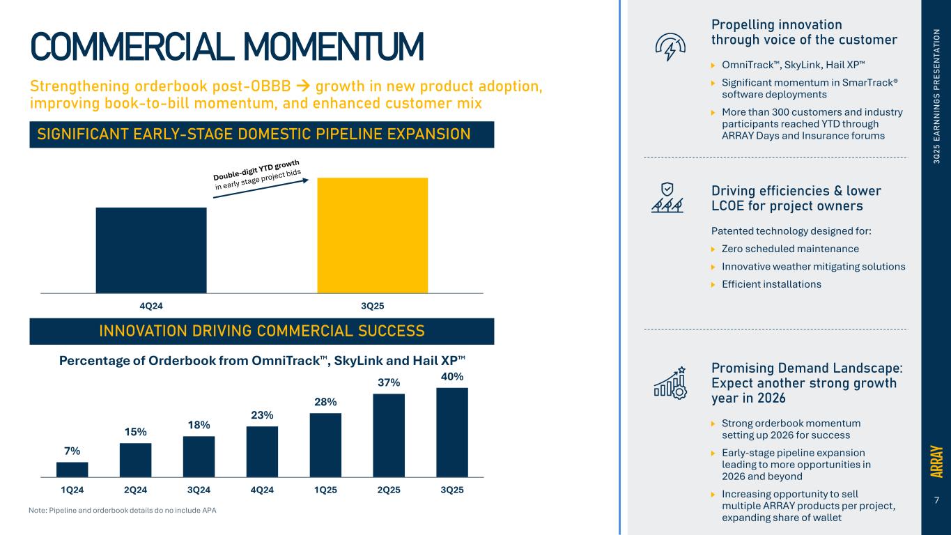 6 APA PRODUCT PORTFOLIO Engineered Foundation Solutions 3 Q 2 5 E A R N N IN G S P R E S E N T A T IO N APA SOLAR UPDATES Product & Commercial Updates Increasing traction in larger utility-scale project opportunities, supported by credibility and bankability with ARRAY Integrated Tracker/Engineered Foundation expected 2H26 Upcoming new product offerings across fixed-tilt and foundation solutions portfolio Integration Update On track with integration goals, including: Process, policies, systems alignment and optimization Leveraging ARRAY’s scale and relationships to drive procurement synergies Launching combined sales strategy for customer engagement and quotation SCREWC-PILE HELICAL GEO-BALLAST POUR-N-GO Fixed-Tilt Mounting Systems
