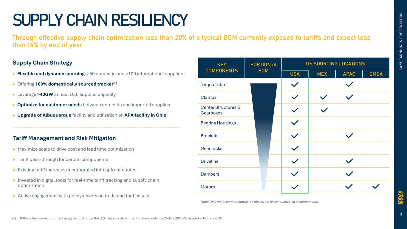7 7% 15% 18% 23% 28% 37% 40% 1Q24 2Q24 3Q24 4Q24 1Q25 2Q25 3Q25 3 Q 2 5 E A R N N IN G S P R E S E N T A T IO N COMMERCIAL MOMENTUM INNOVATION DRIVING COMMERCIAL SUCCESS Note: Pipeline and orderbook details do no include APA Propelling innovation through voice of the customer OmniTrack , SkyLink, Hail XP Significant momentum in SmarTrack® software deployments More than 300 customers and industry participants reached YTD through ARRAY Days and Insurance forums Strengthening orderbook post-OBBB → growth in new product adoption, improving book-to-bill momentum, and enhanced customer mix SIGNIFICANT EARLY-STAGE DOMESTIC PIPELINE EXPANSION 4Q24 3Q25 Driving efficiencies & lower LCOE for project owners Patented technology designed for: Zero scheduled maintenance Innovative weather mitigating solutions Efficient installations Promising Demand Landscape: Expect another strong growth year in 2026 Strong orderbook momentum setting up 2026 for success Early-stage pipeline expansion leading to more opportunities in 2026 and beyond Increasing opportunity to sell multiple ARRAY products per project, expanding share of wallet Percentage of Orderbook from OmniTrack , SkyLink and Hail XP