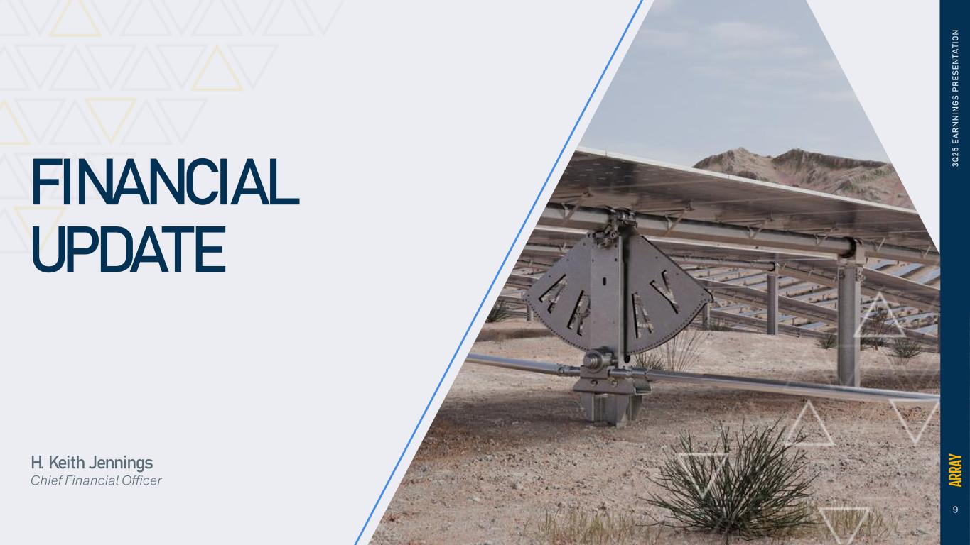 8 SUPPLY CHAIN RESILIENCY KEY COMPONENTS PORTION of BOM US SOURCING LOCATIONS USA MEX APAC EMEA Torque Tube Clamps Center Structures & Gearboxes Bearing Housings Brackets Gear racks Driveline Dampers Motors Note: Only major components listed above, not an exhaustive list of components 3 Q 2 5 E A R N N IN G S P R E S E N T A T IO N Supply Chain Strategy Flexible and dynamic sourcing: >50 domestic and >100 international suppliers Offering 100% domestically sourced tracker(1) Leverage >40GW annual U.S. supplier capacity Optimize for customer needs between domestic and imported supplies Upgrade of Albuquerque facility and utilization of APA facility in Ohio Tariff Management and Risk Mitigation Maximize scale to drive cost and lead time optimization Tariff pass-through for certain components Existing tariff increases incorporated into upfront quotes Invested in digital tools for real-time tariff tracking and supply chain optimization Active engagement with policymakers on trade and tariff issues Through effective supply chain optimization less than 20% of a typical BOM currently exposed to tariffs and expect less than 14% by end of year (1) 100% of the domestic content assigned cost under the U.S. Treasury Department’s latest guidance (Notice 2025-08) issued in January 2025