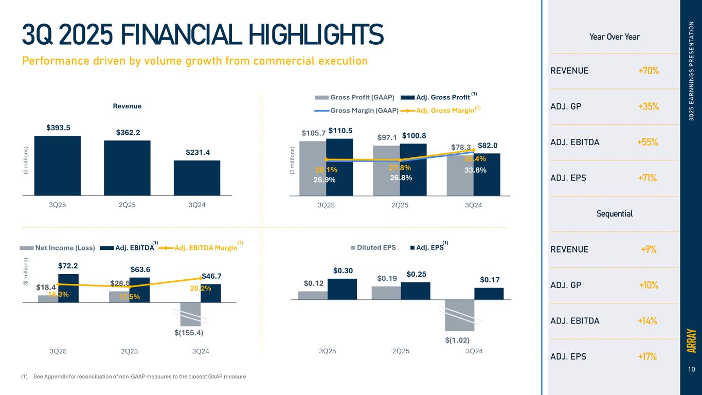 22 3 Q 2 5 E A R N N IN G S P R E S E N T A T IO N ADJUSTED NET INCOME RECONCILIATION Array Technologies, Inc. Three Months Ended (in thousands, except per share amounts) (Unaudited) September 30, 2025 June 30, 2025 September 30, 2024 Net Income (loss) $ 33,503 $ 43,262 $ (141,354) Preferred dividends and accretion 15,144 14,788 14,080 Net income (loss) to common shareholders $ 18,359 $ 28,474 $ (155,434) Amortization of intangibles 6,199 5,078 8,274 Amortization of developed technology and backlog 4,434 3,640 3,639 Amortization of debt discount and issuance costs 879 2,064 1,551 Gain on extinguishment of debts, net - (14,207) - Series A Preferred Stock accretion 7,548 7,393 6,947 Equity based compensation 4,647 3,898 2,023 Change in fair value of contingent consideration 1,014 150 (39) Goodwill impairment - - 162,000 Certain legal expenses (a) - 149 2,270 Acquisition-related expenses(b) 8,944 3,087 - Income tax expense of adjustments (c) (6,262) (975) (4,771) Adjusted net income $ 45,762 $ 38,751 $ 26,460 Income (loss) per common share Basic $ 0.12 $ 0.19 $ (1.02) Diluted $ 0.12 $ 0.19 $ (1.02) Weighted average number of common shares outstanding Basic 152,727 152,584 151,923 Diluted 154,090 153,068 151,923 Adjusted net income per common share Basic $ 0.30 $ 0.25 $ 0.17 Diluted $ 0.30 $ 0.25 $ 0.17 Weighted average number of common shares outstanding Basic 152,727 152,584 151,923 Diluted 154,090 153,068 152,135 a) Represents certain legal fees and other related costs associated with (i) actions filed against the company and certain officers and directors alleging violations of the Securities Act of 1933 and the Securities Exchange Act of 1934, which litigation was dismissed with prejudice by the Court on May 19, 2023 and subsequently appealed. The appeal has been fully briefed, argued, and the Company is awaiting a decision, and (ii) legal and success fees related to a regional tax dispute for a period prior to the acquisition of STI, and (iii) other litigation and legal matters. We consider these costs not representative of legal costs that we will incur from time to time in the ordinary course of our business. b) For the three months ended June 30, 2025 and September 30, 2025, represents acquisition-related expenses and fair value adjustments to inventory and PP&E. c) Represents the estimated tax impact of all Adjusted Net Income add-backs, excluding those which represent permanent differences between book versus tax.
