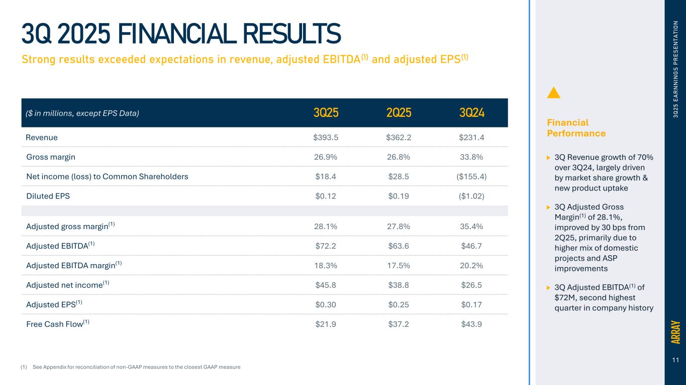 10 3 Q 2 5 E A R N N IN G S P R E S E N T A T IO N 3Q 2025 FINANCIAL HIGHLIGHTS Performance driven by volume growth from commercial execution $393.5 $362.2 $231.4 3Q25 2Q25 3Q24 Revenue $0.12 $0.19 $0.30 $0.25 $0.17 3Q25 2Q25 3Q24 Diluted EPS Adj. EPS $105.7 $97.1 $78.3 $110.5 $100.8 $82.0 26.9% 26.8% 33.8%28.1% 27.8% 35.4% 3Q25 2Q25 3Q24 Gross Profit (GAAP) Adj. Gross Profit Gross Margin (GAAP) Adj. Gross Margin $18.4 $28.5 $72.2 $63.6 $46.7 18.3% 17.5% 20.2% 3Q25 2Q25 3Q24 Net Income (Loss) Adj. EBITDA Adj. EBITDA Margin Year Over Year REVENUE +70% ADJ. GP +35% ADJ. EBITDA +55% ADJ. EPS +71% Sequential REVENUE +9% ADJ. GP +10% ADJ. EBITDA +14% ADJ. EPS +17% ($ m ill io ns ) ($ m ill io ns ) ($ m ill io ns ) (1) (1) (1) (1)(1) (1) See Appendix for reconciliation of non-GAAP measures to the closest GAAP measure $(155.4) $(1.02)