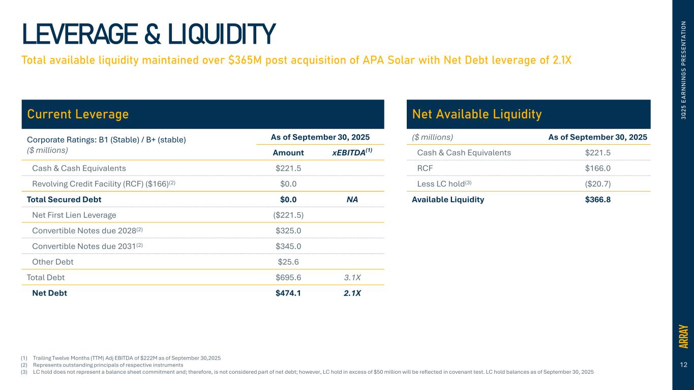 12 3 Q 2 5 E A R N N IN G S P R E S E N T A T IO N LEVERAGE & LIQUIDITY Total available liquidity maintained over $365M post acquisition of APA Solar with Net Debt leverage of 2.1X Current Leverage Corporate Ratings: B1 (Stable) / B+ (stable) ($ millions) As of September 30, 2025 Amount xEBITDA(1) Cash & Cash Equivalents $221.5 Revolving Credit Facility (RCF) ($166)(2) $0.0 Total Secured Debt $0.0 NA Net First Lien Leverage ($221.5) Convertible Notes due 2028(2) $325.0 Convertible Notes due 2031(2) $345.0 Other Debt $25.6 Total Debt $695.6 3.1X Net Debt $474.1 2.1X Net Available Liquidity ($ millions) As of September 30, 2025 Cash & Cash Equivalents $221.5 RCF $166.0 Less LC hold(3) ($20.7) Available Liquidity $366.8 (1) Trailing Twelve Months (TTM) Adj EBITDA of $222M as of September 30,2025 (2) Represents outstanding principals of respective instruments (3) LC hold does not represent a balance sheet commitment and; therefore, is not considered part of net debt; however, LC hold in excess of $50 million will be reflected in covenant test. LC hold balances as of September 30, 2025