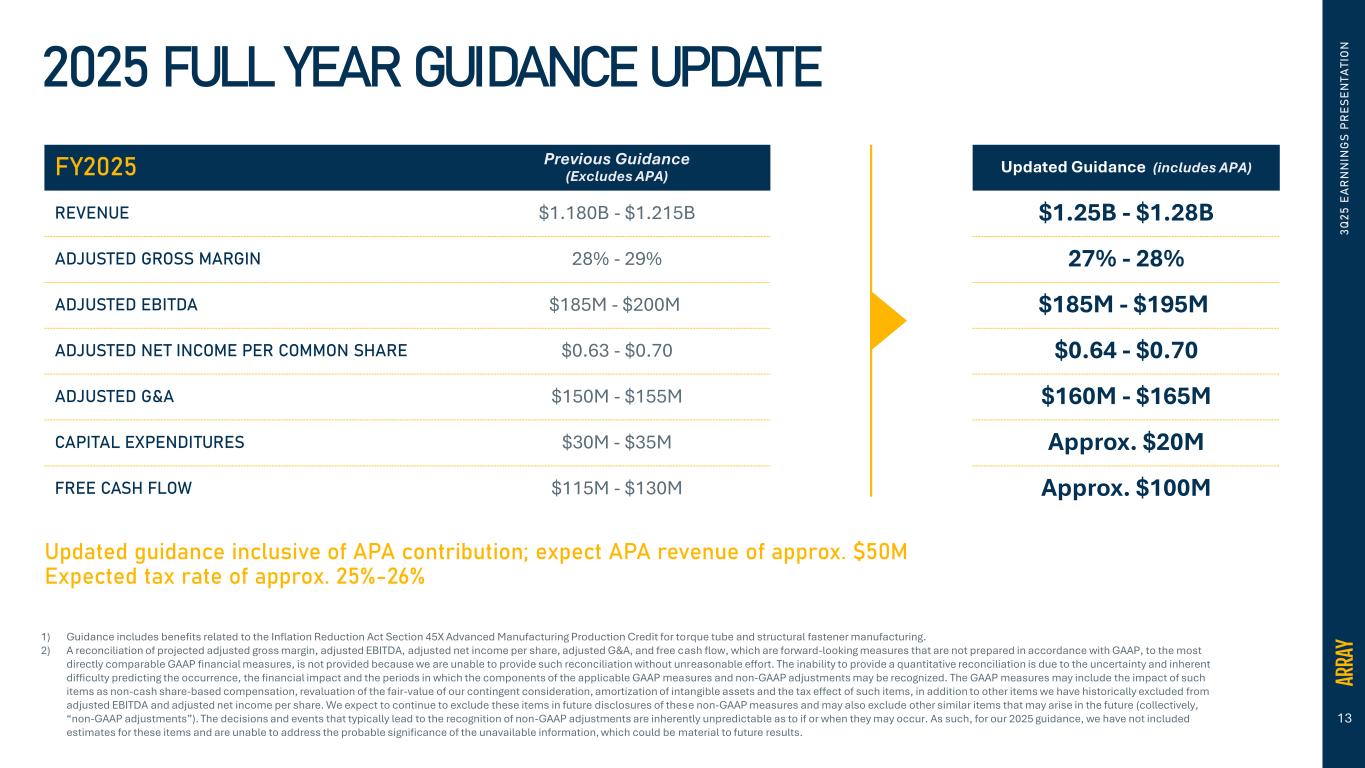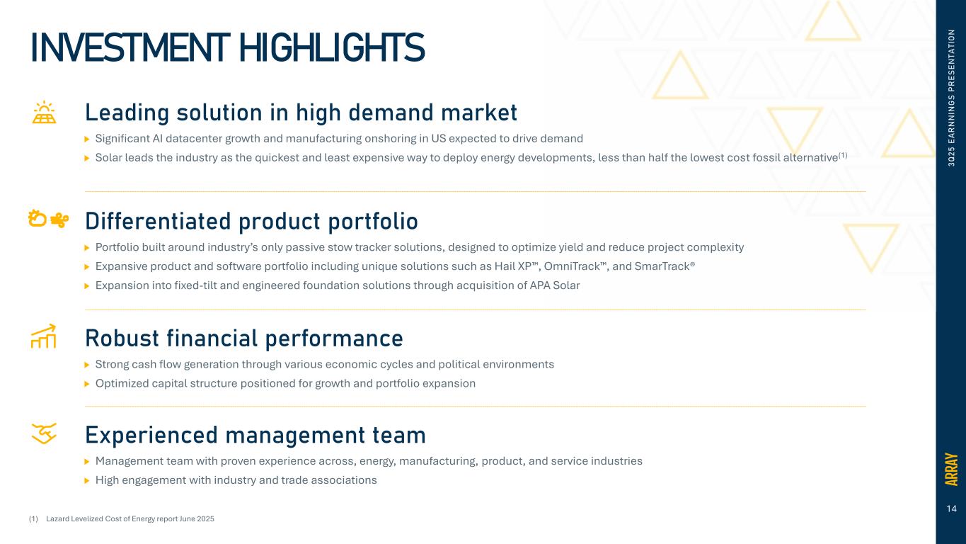13 3 Q 2 5 E A R N N IN G S P R E S E N T A T IO N 2025 FULL YEAR GUIDANCE UPDATE FY2025 Previous Guidance (Excludes APA) REVENUE $1.180B - $1.215B ADJUSTED GROSS MARGIN 28% - 29% ADJUSTED EBITDA $185M - $200M ADJUSTED NET INCOME PER COMMON SHARE $0.63 - $0.70 ADJUSTED G&A $150M - $155M CAPITAL EXPENDITURES $30M - $35M FREE CASH FLOW $115M - $130M Updated Guidance (includes APA) $1.25B - $1.28B 27% - 28% $185M - $195M $0.64 - $0.70 $160M - $165M Approx. $20M Approx. $100M Updated guidance inclusive of APA contribution; expect APA revenue of approx. $50M Expected tax rate of approx. 25%-26% 1) Guidance includes benefits related to the Inflation Reduction Act Section 45X Advanced Manufacturing Production Credit for torque tube and structural fastener manufacturing. 2) A reconciliation of projected adjusted gross margin, adjusted EBITDA, adjusted net income per share, adjusted G&A, and free cash flow, which are forward-looking measures that are not prepared in accordance with GAAP, to the most directly comparable GAAP financial measures, is not provided because we are unable to provide such reconciliation without unreasonable effort. The inability to provide a quantitative reconciliation is due to the uncertainty and inherent difficulty predicting the occurrence, the financial impact and the periods in which the components of the applicable GAAP measures and non-GAAP adjustments may be recognized. The GAAP measures may include the impact of such items as non-cash share-based compensation, revaluation of the fair-value of our contingent consideration, amortization of intangible assets and the tax effect of such items, in addition to other items we have historically excluded from adjusted EBITDA and adjusted net income per share. We expect to continue to exclude these items in future disclosures of these non-GAAP measures and may also exclude other similar items that may arise in the future (collectively, “non-GAAP adjustments”). The decisions and events that typically lead to the recognition of non-GAAP adjustments are inherently unpredictable as to if or when they may occur. As such, for our 2025 guidance, we have not included estimates for these items and are unable to address the probable significance of the unavailable information, which could be material to future results.