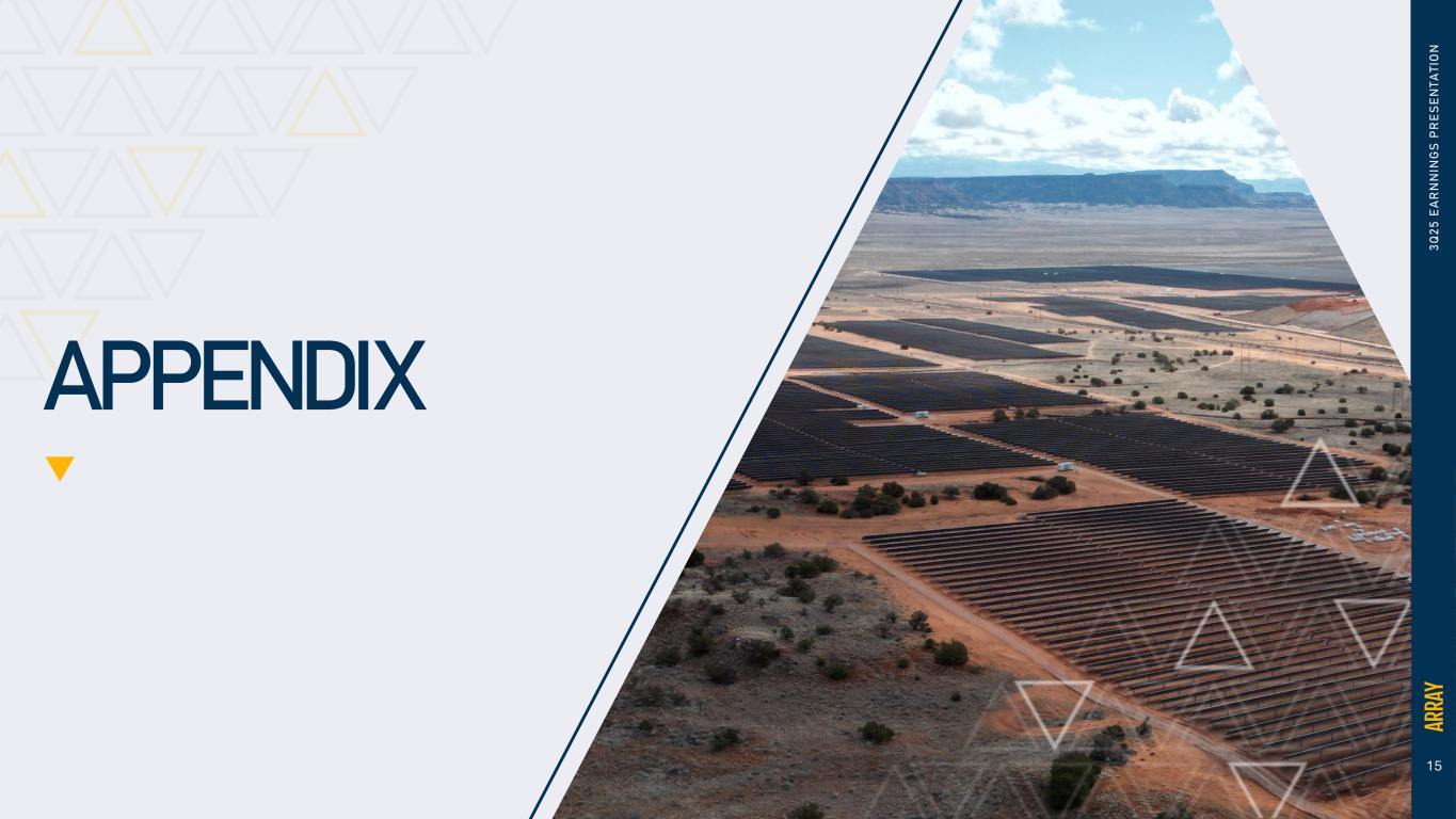 14 3 Q 2 5 E A R N N IN G S P R E S E N T A T IO N INVESTMENT HIGHLIGHTS Leading solution in high demand market Significant AI datacenter growth and manufacturing onshoring in US expected to drive demand Solar leads the industry as the quickest and least expensive way to deploy energy developments, less than half the lowest cost fossil alternative(1) Differentiated product portfolio Portfolio built around industry’s only passive stow tracker solutions, designed to optimize yield and reduce project complexity Expansive product and software portfolio including unique solutions such as Hail XP , OmniTrack , and SmarTrack® Expansion into fixed-tilt and engineered foundation solutions through acquisition of APA Solar Robust financial performance Strong cash flow generation through various economic cycles and political environments Optimized capital structure positioned for growth and portfolio expansion Experienced management team Management team with proven experience across, energy, manufacturing, product, and service industries High engagement with industry and trade associations (1) Lazard Levelized Cost of Energy report June 2025