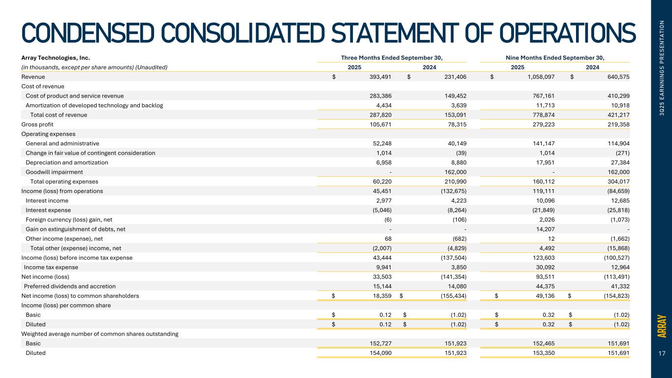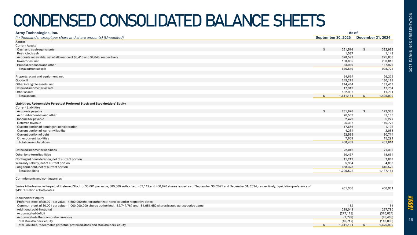 16 Array Technologies, Inc. As of (in thousands, except per share and share amounts) (Unaudited) September 30, 2025 December 31, 2024 Assets Current Assets Cash and cash equivalents $ 221,516 $ 362,992 Restricted cash 1,587 1,149 Accounts receivable, net of allowance of $8,418 and $4,848, respectively 378,592 275,838 Inventories, net 180,885 200,818 Prepaid expenses and other 83,969 157,927 Total current assets 866,549 998,724 Property, plant and equipment, net 54,664 26,222 Goodwill 245,215 160,189 Other intangible assets, net 244,484 181,409 Deferred income tax assets 17,312 17,754 Other assets 182,937 41,701 Total assets $ 1,611,161 $ 1,425,999 Liabilities, Redeemable Perpetual Preferred Stock and Stockholders' Equity Current Liabilities Accounts payable $ 231,876 $ 172,368 Accrued expenses and other 76,583 91,183 Income tax payable 2,479 5,227 Deferred revenue 95,387 119,775 Current portion of contingent consideration 17,666 1,193 Current portion of warranty liability 4,234 2,063 Current portion of debt 22,595 30,714 Other current liabilities 7,669 15,291 Total current liabilities 458,489 437,814 Deferred income tax liabilities 22,042 21,398 Other long-term liabilities 50,467 18,684 Contingent consideration, net of current portion 11,212 7,868 Warranty liability, net of current portion 5,984 4,830 Long-term debt, net of current portion 658,378 646,570 Total liabilities 1,206,572 1,137,164 Commitments and contingencies Series A Redeemable Perpetual Preferred Stock of $0.001 par value; 500,000 authorized; 483,112 and 460,920 shares issued as of September 30, 2025 and December 31, 2024, respectively; liquidation preference of $493.1 million at both dates 451,306 406,931 Stockholders' equity Preferred stock of $0.001 par value - 4,500,000 shares authorized; none issued at respective dates - - Common stock of $0.001 par value - 1,000,000,000 shares authorized; 152,747,767 and 151,951,652 shares issued at respective dates 152 151 Additional paid-in capital 238,043 297,780 Accumulated deficit (277,113) (370,624) Accumulated other comprehensive loss (7,799) (45,403) Total stockholders' equity (46,717) (118,096) Total liabilities, redeemable perpetual preferred stock and stockholders' equity $ 1,611,161 $ 1,425,999 3 Q 2 5 E A R N N IN G S P R E S E N T A T IO N CONDENSED CONSOLIDATED BALANCE SHEETS
