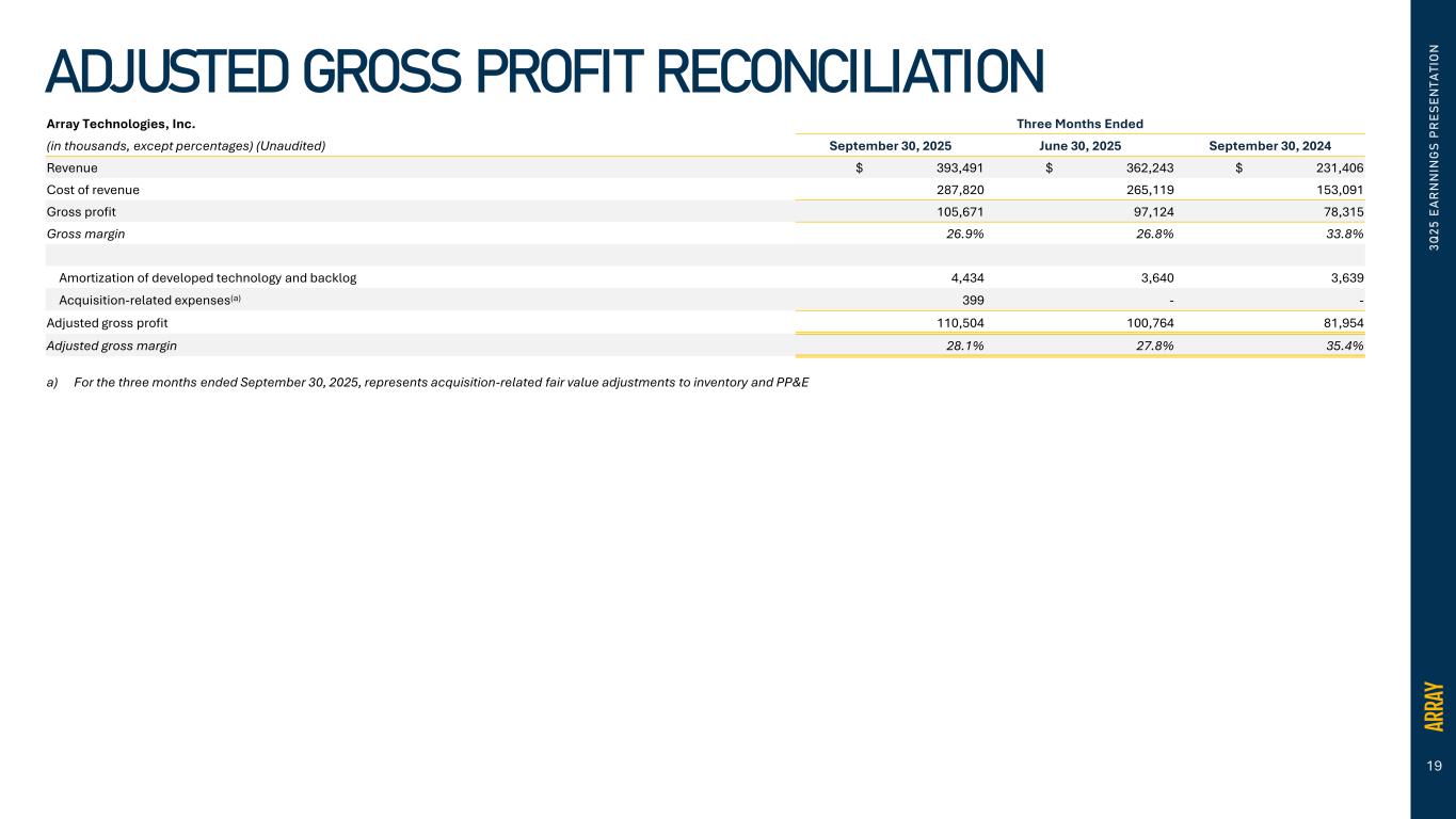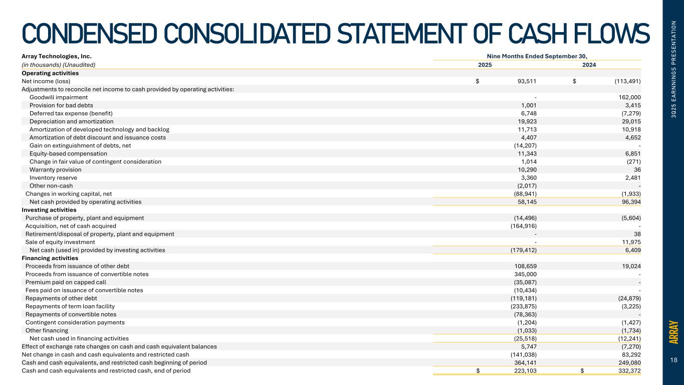 18 3 Q 2 5 E A R N N IN G S P R E S E N T A T IO N CONDENSED CONSOLIDATED STATEMENT OF CASH FLOWS Array Technologies, Inc. Nine Months Ended September 30, (in thousands) (Unaudited) 2025 2024 Operating activities Net income (loss) $ 93,511 $ (113,491) Adjustments to reconcile net income to cash provided by operating activities: Goodwill impairment - 162,000 Provision for bad debts 1,001 3,415 Deferred tax expense (benefit) 6,748 (7,279) Depreciation and amortization 19,923 29,015 Amortization of developed technology and backlog 11,713 10,918 Amortization of debt discount and issuance costs 4,407 4,652 Gain on extinguishment of debts, net (14,207) - Equity-based compensation 11,343 6,851 Change in fair value of contingent consideration 1,014 (271) Warranty provision 10,290 36 Inventory reserve 3,360 2,481 Other non-cash (2,017) - Changes in working capital, net (88,941) (1,933) Net cash provided by operating activities 58,145 96,394 Investing activities Purchase of property, plant and equipment (14,496) (5,604) Acquisition, net of cash acquired (164,916) - Retirement/disposal of property, plant and equipment - 38 Sale of equity investment - 11,975 Net cash (used in) provided by investing activities (179,412) 6,409 Financing activities Proceeds from issuance of other debt 108,659 19,024 Proceeds from issuance of convertible notes 345,000 - Premium paid on capped call (35,087) - Fees paid on issuance of convertible notes (10,434) - Repayments of other debt (119,181) (24,879) Repayments of term loan facility (233,875) (3,225) Repayments of convertible notes (78,363) - Contingent consideration payments (1,204) (1,427) Other financing (1,033) (1,734) Net cash used in financing activities (25,518) (12,241) Effect of exchange rate changes on cash and cash equivalent balances 5,747 (7,270) Net change in cash and cash equivalents and restricted cash (141,038) 83,292 Cash and cash equivalents, and restricted cash beginning of period 364,141 249,080 Cash and cash equivalents and restricted cash, end of period $ 223,103 $ 332,372