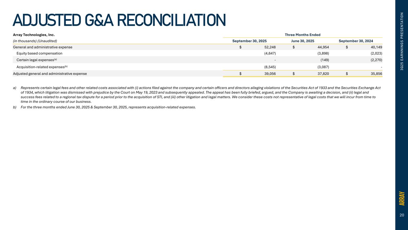 19 3 Q 2 5 E A R N N IN G S P R E S E N T A T IO N ADJUSTED GROSS PROFIT RECONCILIATION Array Technologies, Inc. Three Months Ended (in thousands, except percentages) (Unaudited) September 30, 2025 June 30, 2025 September 30, 2024 Revenue $ 393,491 $ 362,243 $ 231,406 Cost of revenue 287,820 265,119 153,091 Gross profit 105,671 97,124 78,315 Gross margin 26.9% 26.8% 33.8% Amortization of developed technology and backlog 4,434 3,640 3,639 Acquisition-related expenses(a) 399 - - Adjusted gross profit 110,504 100,764 81,954 Adjusted gross margin 28.1% 27.8% 35.4% a) For the three months ended September 30, 2025, represents acquisition-related fair value adjustments to inventory and PP&E