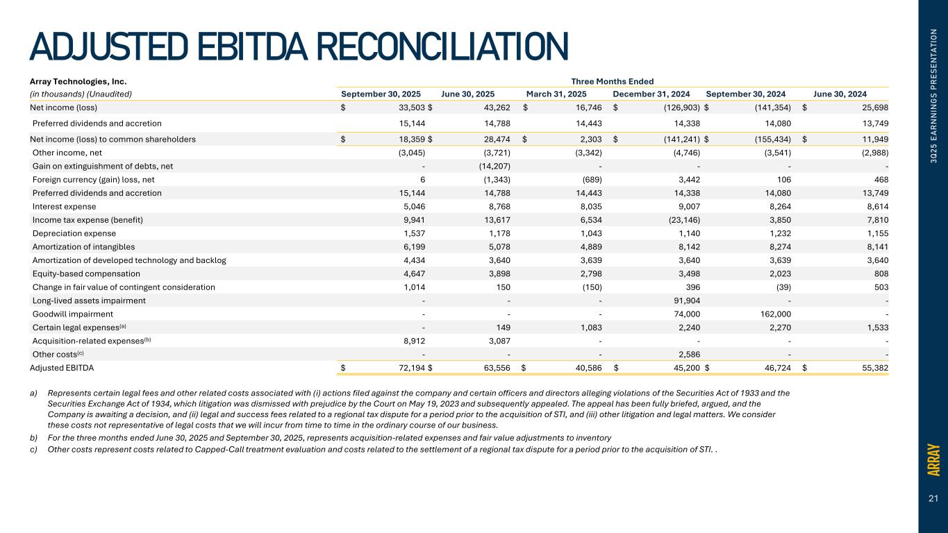 20 Array Technologies, Inc. Three Months Ended (in thousands) (Unaudited) September 30, 2025 June 30, 2025 September 30, 2024 General and administrative expense $ 52,248 $ 44,954 $ 40,149 Equity based compensation (4,647) (3,898) (2,023) Certain legal expenses(a) - (149) (2,270) Acquisition-related expenses(b) (8,545) (3,087) - Adjusted general and administrative expense $ 39,056 $ 37,820 $ 35,856 a) Represents certain legal fees and other related costs associated with (i) actions filed against the company and certain officers and directors alleging violations of the Securities Act of 1933 and the Securities Exchange Act of 1934, which litigation was dismissed with prejudice by the Court on May 19, 2023 and subsequently appealed. The appeal has been fully briefed, argued, and the Company is awaiting a decision, and (ii) legal and success fees related to a regional tax dispute for a period prior to the acquisition of STI, and (iii) other litigation and legal matters. We consider these costs not representative of legal costs that we will incur from time to time in the ordinary course of our business. b) For the three months ended June 30, 2025 & September 30, 2025, represents acquisition-related expenses. 3 Q 2 5 E A R N N IN G S P R E S E N T A T IO N ADJUSTED G&A RECONCILIATION
