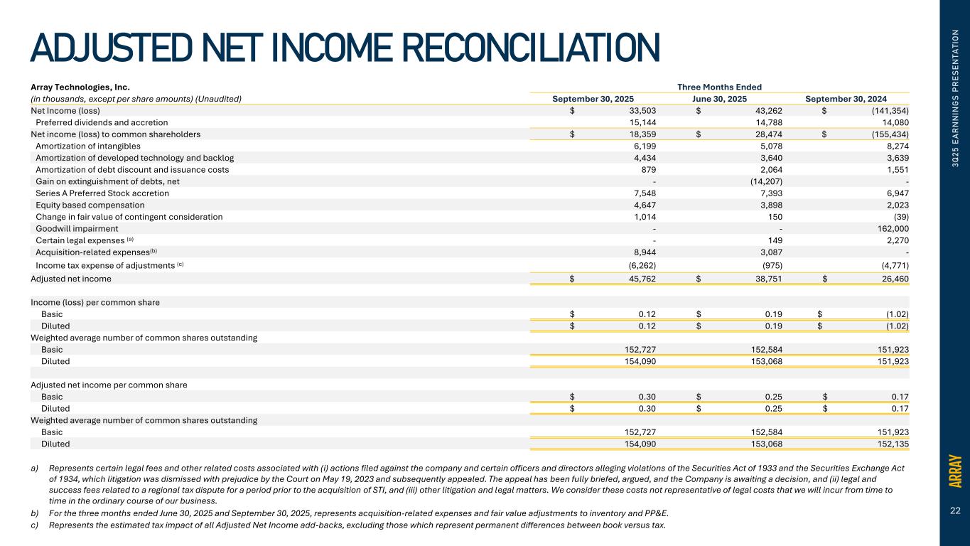21 Array Technologies, Inc. Three Months Ended (in thousands) (Unaudited) September 30, 2025 June 30, 2025 March 31, 2025 December 31, 2024 September 30, 2024 June 30, 2024 Net income (loss) $ 33,503 $ 43,262 $ 16,746 $ (126,903) $ (141,354) $ 25,698 Preferred dividends and accretion 15,144 14,788 14,443 14,338 14,080 13,749 Net income (loss) to common shareholders $ 18,359 $ 28,474 $ 2,303 $ (141,241) $ (155,434) $ 11,949 Other income, net (3,045) (3,721) (3,342) (4,746) (3,541) (2,988) Gain on extinguishment of debts, net - (14,207) - - - - Foreign currency (gain) loss, net 6 (1,343) (689) 3,442 106 468 Preferred dividends and accretion 15,144 14,788 14,443 14,338 14,080 13,749 Interest expense 5,046 8,768 8,035 9,007 8,264 8,614 Income tax expense (benefit) 9,941 13,617 6,534 (23,146) 3,850 7,810 Depreciation expense 1,537 1,178 1,043 1,140 1,232 1,155 Amortization of intangibles 6,199 5,078 4,889 8,142 8,274 8,141 Amortization of developed technology and backlog 4,434 3,640 3,639 3,640 3,639 3,640 Equity-based compensation 4,647 3,898 2,798 3,498 2,023 808 Change in fair value of contingent consideration 1,014 150 (150) 396 (39) 503 Long-lived assets impairment - - - 91,904 - - Goodwill impairment - - - 74,000 162,000 - Certain legal expenses(a) - 149 1,083 2,240 2,270 1,533 Acquisition-related expenses(b) 8,912 3,087 - - - - Other costs(c) - - - 2,586 - - Adjusted EBITDA $ 72,194 $ 63,556 $ 40,586 $ 45,200 $ 46,724 $ 55,382 a) Represents certain legal fees and other related costs associated with (i) actions filed against the company and certain officers and directors alleging violations of the Securities Act of 1933 and the Securities Exchange Act of 1934, which litigation was dismissed with prejudice by the Court on May 19, 2023 and subsequently appealed. The appeal has been fully briefed, argued, and the Company is awaiting a decision, and (ii) legal and success fees related to a regional tax dispute for a period prior to the acquisition of STI, and (iii) other litigation and legal matters. We consider these costs not representative of legal costs that we will incur from time to time in the ordinary course of our business. b) For the three months ended June 30, 2025 and September 30, 2025, represents acquisition-related expenses and fair value adjustments to inventory c) Other costs represent costs related to Capped-Call treatment evaluation and costs related to the settlement of a regional tax dispute for a period prior to the acquisition of STI. . 3 Q 2 5 E A R N N IN G S P R E S E N T A T IO N ADJUSTED EBITDA RECONCILIATION