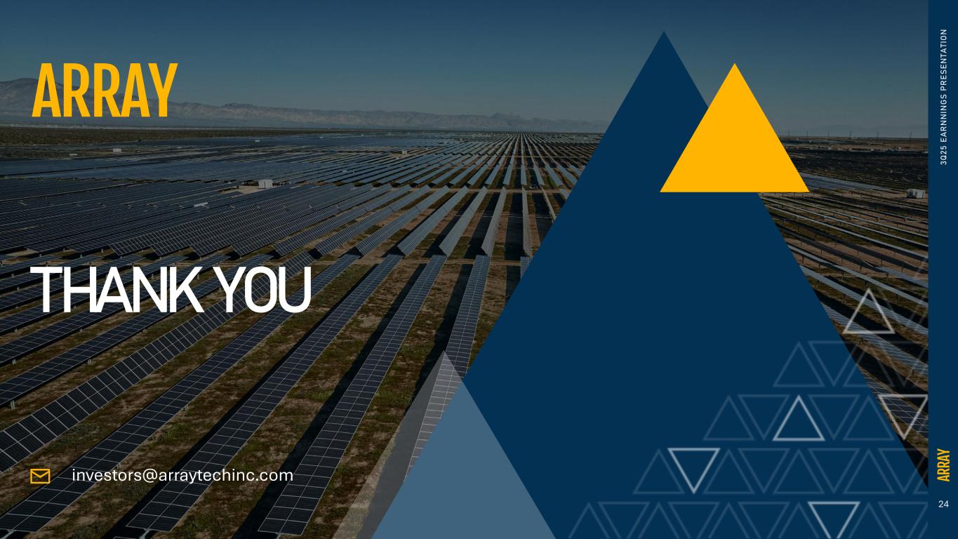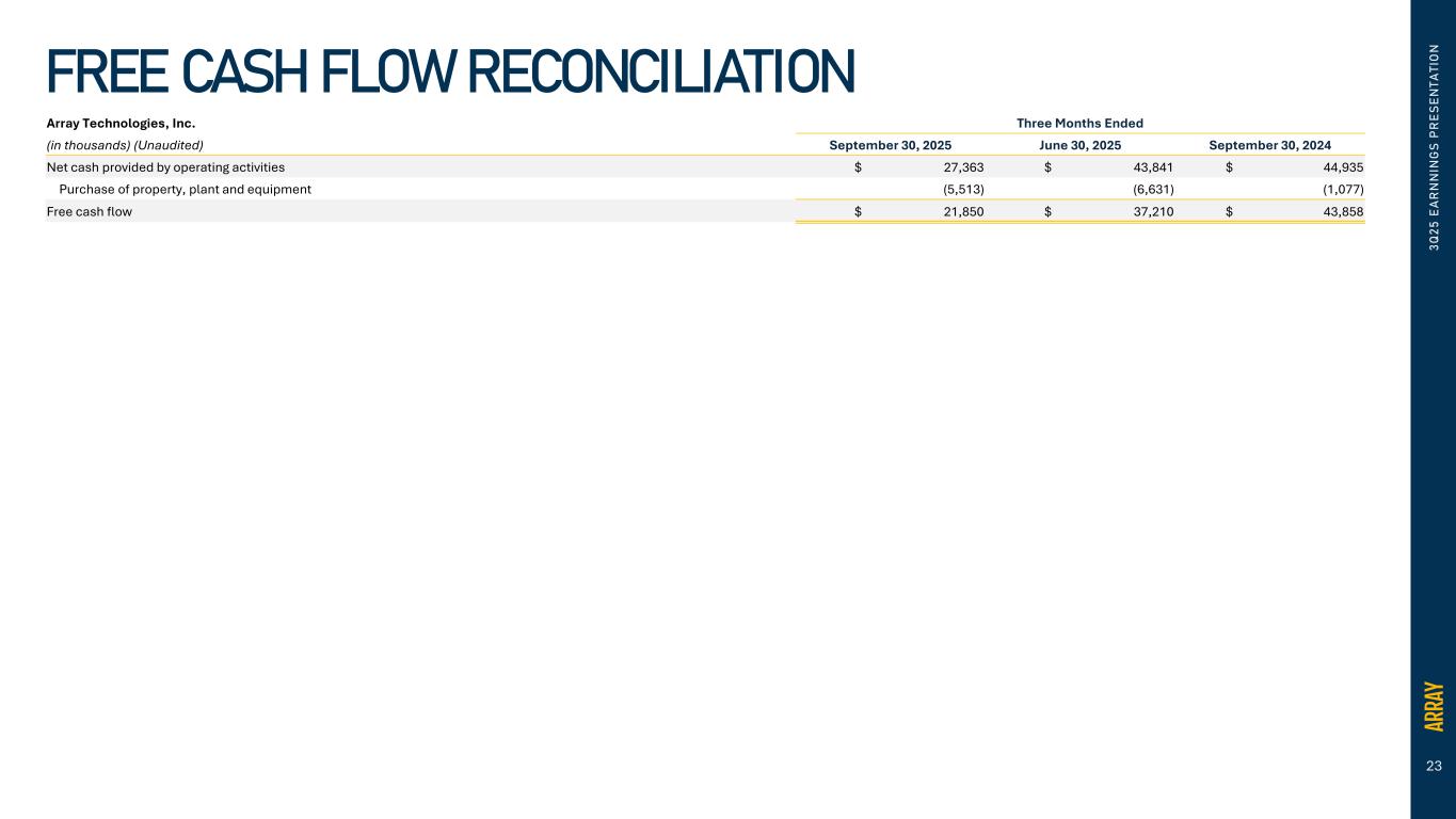 23 3 Q 2 5 E A R N N IN G S P R E S E N T A T IO N FREE CASH FLOW RECONCILIATION Array Technologies, Inc. Three Months Ended (in thousands) (Unaudited) September 30, 2025 June 30, 2025 September 30, 2024 Net cash provided by operating activities $ 27,363 $ 43,841 $ 44,935 Purchase of property, plant and equipment (5,513) (6,631) (1,077) Free cash flow $ 21,850 $ 37,210 $ 43,858